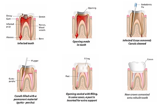 To understand this better we need to know about the basic tooth structure. A Tooth consists of a hard outer layer of ENAMEL, followed by a thick layer of DENTIN & a soft chamber of PULP inside which contains the blood vessels, Nerves & the connective tissues. As a cavity develops over a period of time, it starts from the Enamel & end in the Pulp which will require a Root canal Therapy.